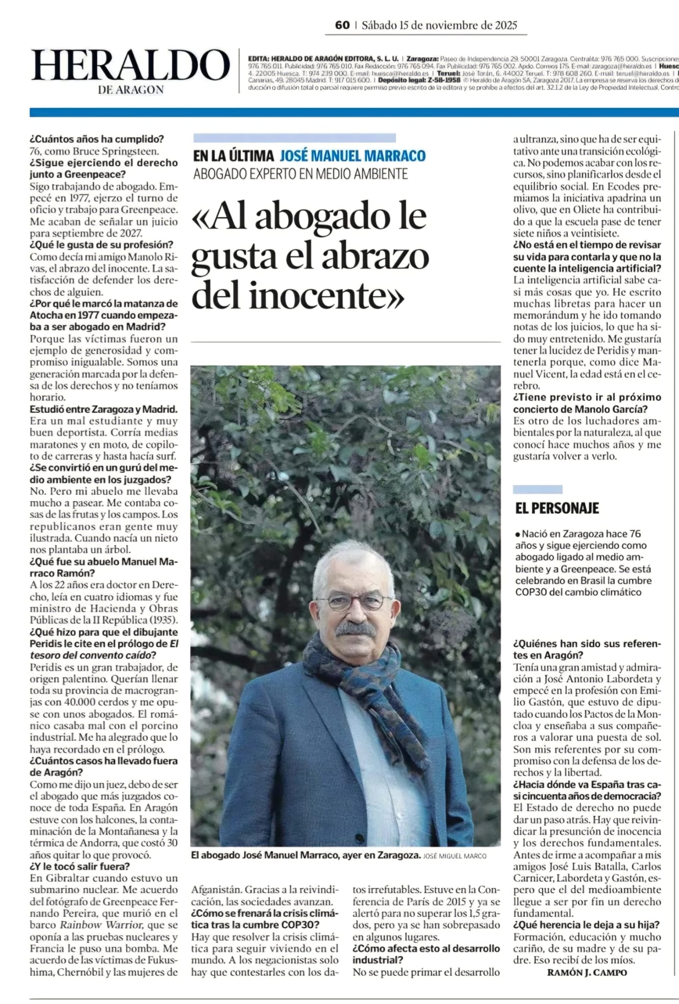 Contraportada, El Heraldo de Aragón, Entrevista a José Manuel Marraco: «El derecho al medio ambiente tiene que ser considerado un derecho fundamental»